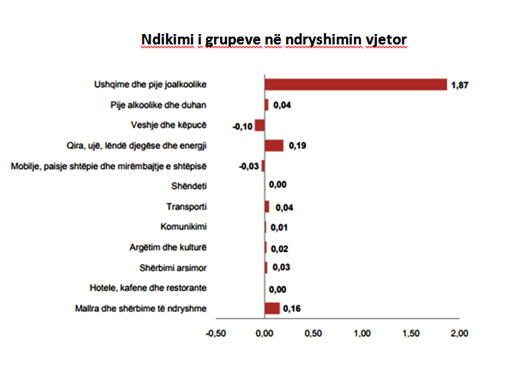 Krahasuar me muajin Qershor 2016, rritja më e madhe e çmimeve vërehet në grupin “ushqime dhe pije joalkoolike” me 5,1 %, pasuar nga grupet “mallra dhe shërbime të ndryshme” me 3,2 %, “qira, ujë, lëndë djegëse dhe energji” me 0,9 %, “pije alkoolike dhe duhan” me 0,8 %, “transporti” dhe “shërbimi arsimor” me 0,7 %, “argëtim dhe kulturë” me 0,6 %, etj. Brenda grupit të ushqimeve çmimet e nëngrupit “fruta” u rritën me 16,8 %, pasuar nga nëngrupet “zarzavate përfshirë patatet“ me 12,1 %, “qumësht, djath e vezë” me 4,3 %, “peshk” me 3,7 %, “sheqer, reçelna e ëmbëlsira” me 2,7 %, etj. Nga ana tjetër çmimet e nëngrupit “vajra dhe yndyrna” u ulën me 2,9 %. Krahasuar me muajin Qershor 2016, rritja më e madhe e çmimeve vërehet në grupin “ushqime dhe pije joalkoolike” me 5,1 %.